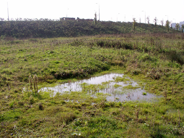 ![]() Photo 4: A puddle along the highway. Because road construction waste is used for the reinforcement of the dike, a hard underlay is created on which rain water remains. These pools can yield more interesting species than the surrounding (contaminated) ditches. |