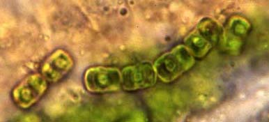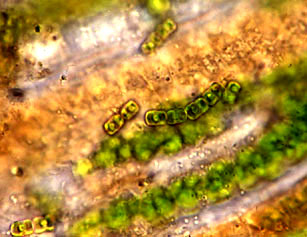 Desmids: Giants and DwarfsAlthough, in general, cell dimensions of desmids are larger than those in most other unicellular algal groups, there are huge differences between the various species. The smallest species are less than 10 micrometer in length (1000 µm = 1 millimeter), such as Actinotaenium geniculatum, an acidophilous desmid that is usually associated with peat moss. |