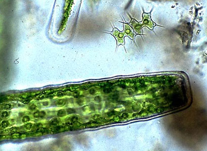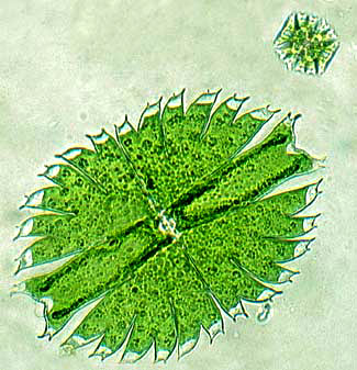 Large in two dimensions are the cells of many Micrasterias species, such as the widely spread species M. thomasiana and M. rotata. Also a number of tropical species are striking by their large cell size. |
