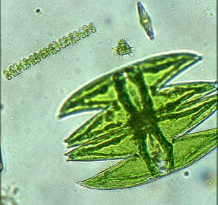 image on the right: Micrasterias laticeps (ca 100 x 160 µm) next to a small, unidentified Staurastrum species (in apical view) and a filamentous colony of Teilingia granulata (cell size ca 7 x 7 µm) |