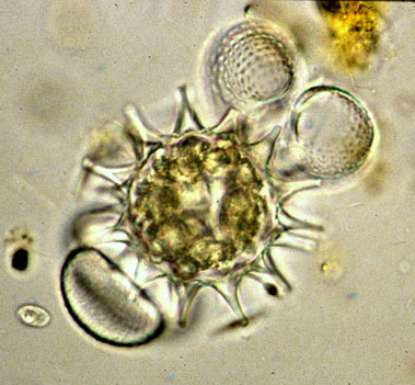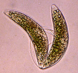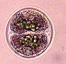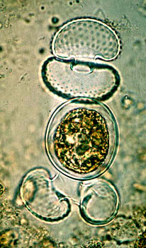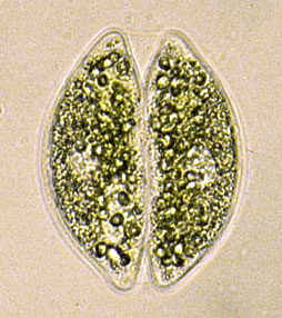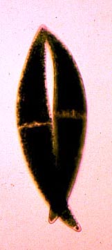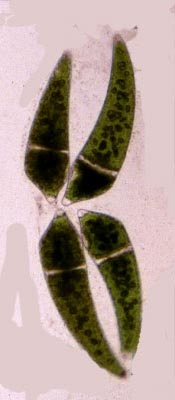 Detailed sexual cycles, at best to be studied in culture, are known from but a few species (see also Brook, 1981). One of the species studied is Closterium ehrenbergii, characterized by the formation of twin zygospores. Twin zygospores are formed when partner cells undergo cell division immediately before conjugation so that actually four cells, lieing close together, participate in the mating process. |