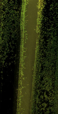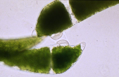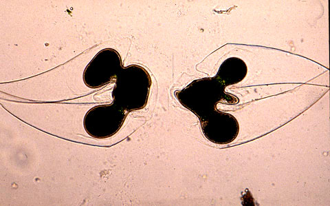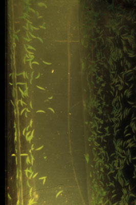 Left: An agar strip (ca 5 mm in breadth) separates suspensions of + (left) and – (right) cells of Closterium ehrenbergii. + Cells are penetrating the agar strip, moving towards the – cells. Right: Idem, in detail. (more information in Coesel & De Jong, 1986) |