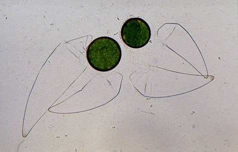 | Smooth-walled zygospore of Cosmarium reniforme with adhering empty gametangial cells. | Spiny zygospore of Cosmarium botrytis with adhering empty gametangial cells. both images © Peter Coesel |