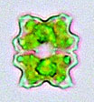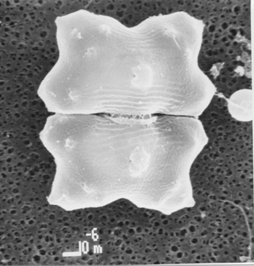 Euastrum gayanum. Notice about trapeziform semicells with deeply concave lateral sides and wide, V-shaped apical indentation.